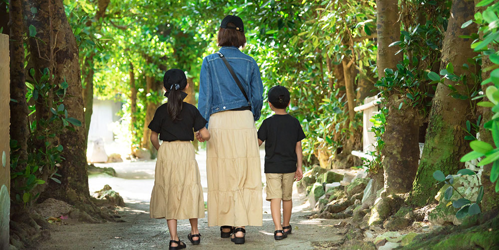 台風の多い沖縄において、防風林として家を取り囲むようにフクギが植えられています。そのフクギが連なり、備瀬崎までのおよそ1kmの並木道になっているのが「備瀬のフクギ並木通り」です。 250年以上前から守られ続けているフクギ並木のなかには、推定樹齢300年を超える木もあると言われており、差し込む日差しと落ち着いた葉擦れの音、穏やかな空気がかつての沖縄の集落の様子を思い起こし、ゆったりとした時間の流れを感じさせてくれます。